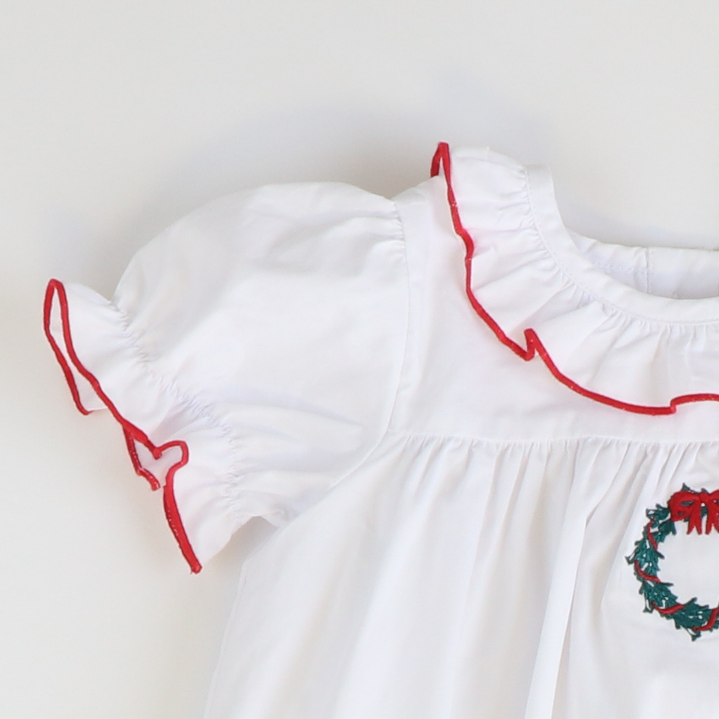 Bring her the spirit of Christmas with our stunning Embroidered Wreath Heirloom Dress! Beautifully embroidered dress is in a gorgeous holiday white and features a ruffle neckline and delicately puffed elasticized sleeves with red trim. Fully lined.