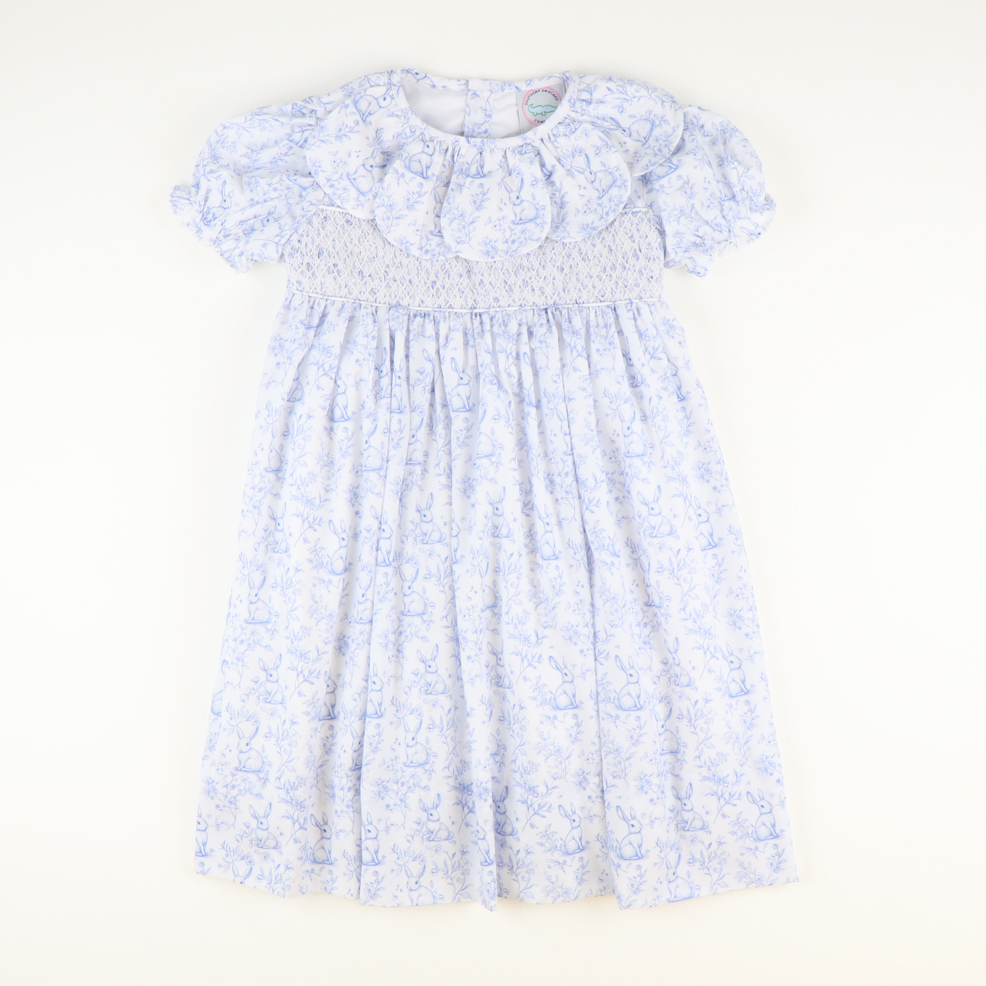 Petal Collar Smocked Dress- Blue Bunny Toile