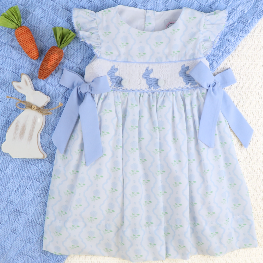 Our Smocked Blue Bunnies Dress is a timeless favorite for Easter portraits, egg hunts, and everything in between! Darling smocked dress is in our beautiful Hydrangea Bloom Print and features stylish flutter sleeves, sweet light blue side ties, light blue picot, and piping trim. She will love the fluffy tail detail on the adorable smocked blue bunnies!