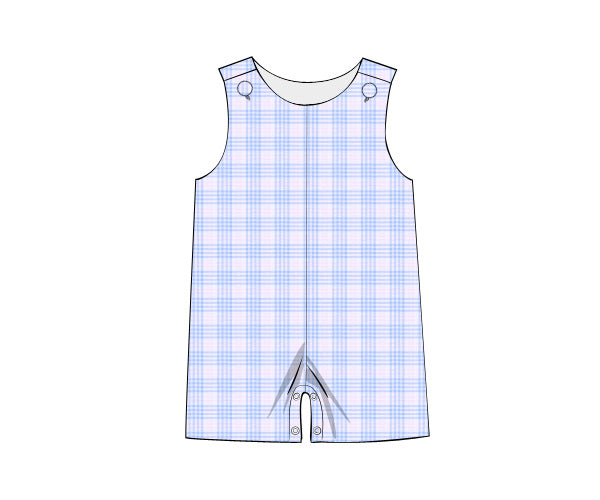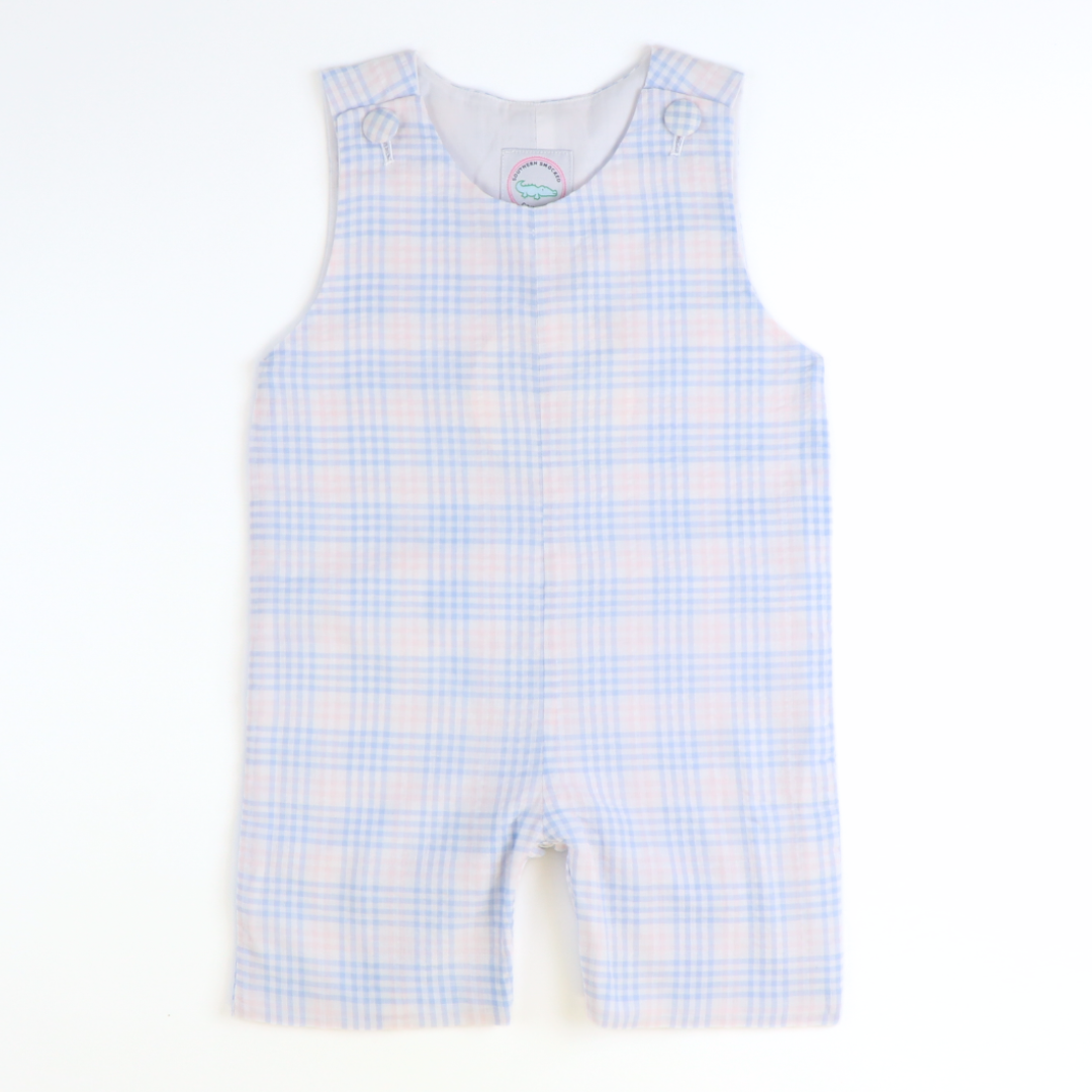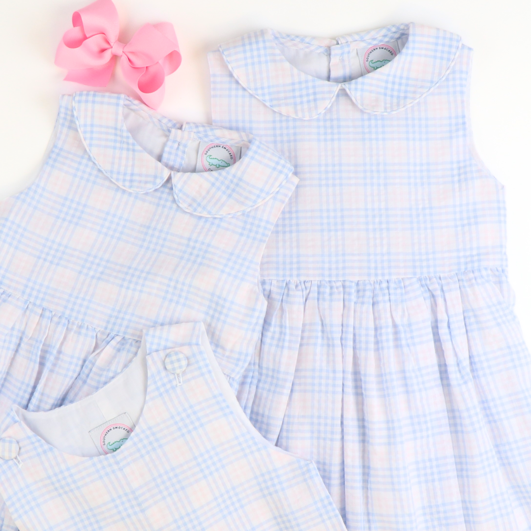 Our classic and timeless Sunday Brunch Collection is perfect for all his occasions! Our Sunday Brunch Shortall is in a gorgeous blue & pink plaid soft seersucker and features matching shoulder buttons. Snaps in stride. Matching dress, little girl bubble, and button down short sleeve shirt are also available. Personalize it for him with an add-on monogram!